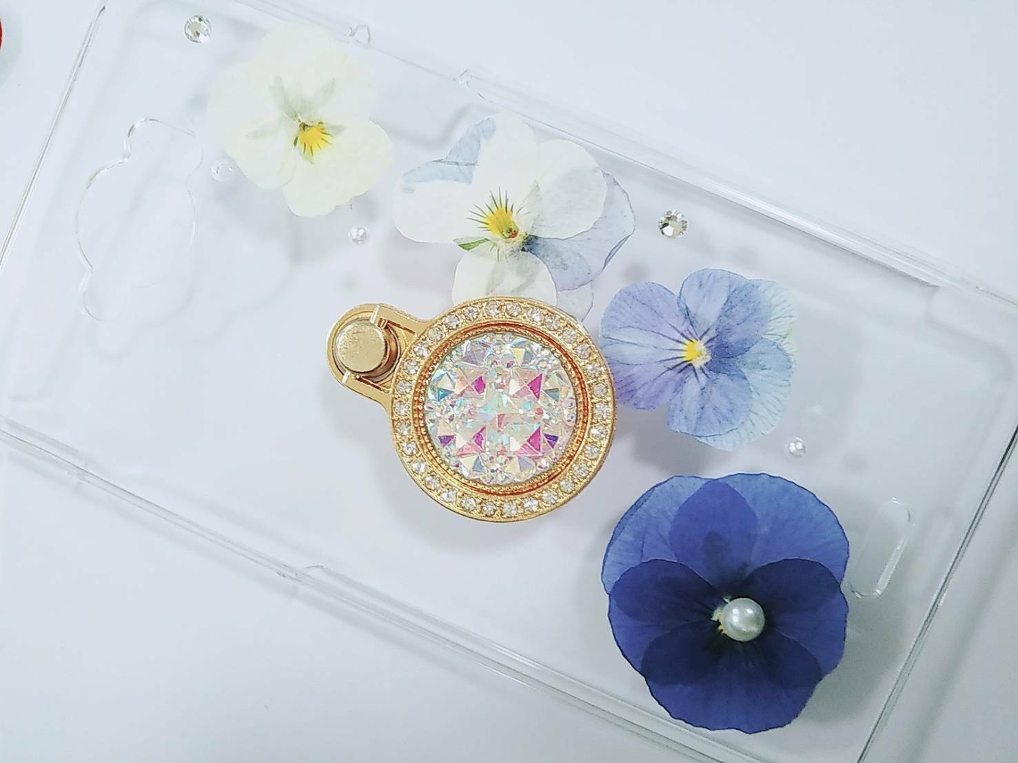 ハンドメイド 全機種対応のバンカーリング付き手作り押し花(ドライフラワー)スマホケースです。