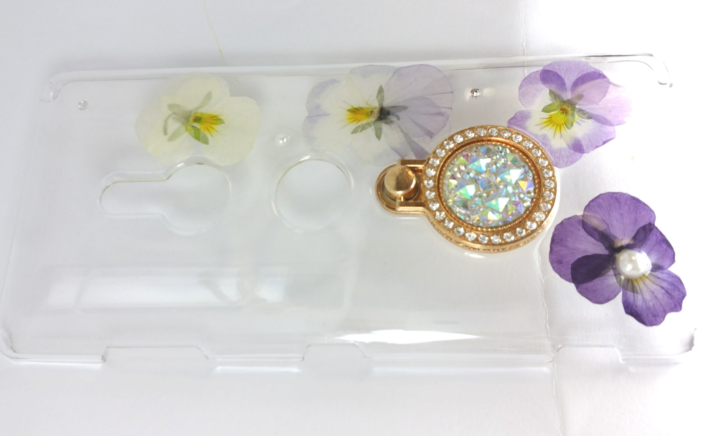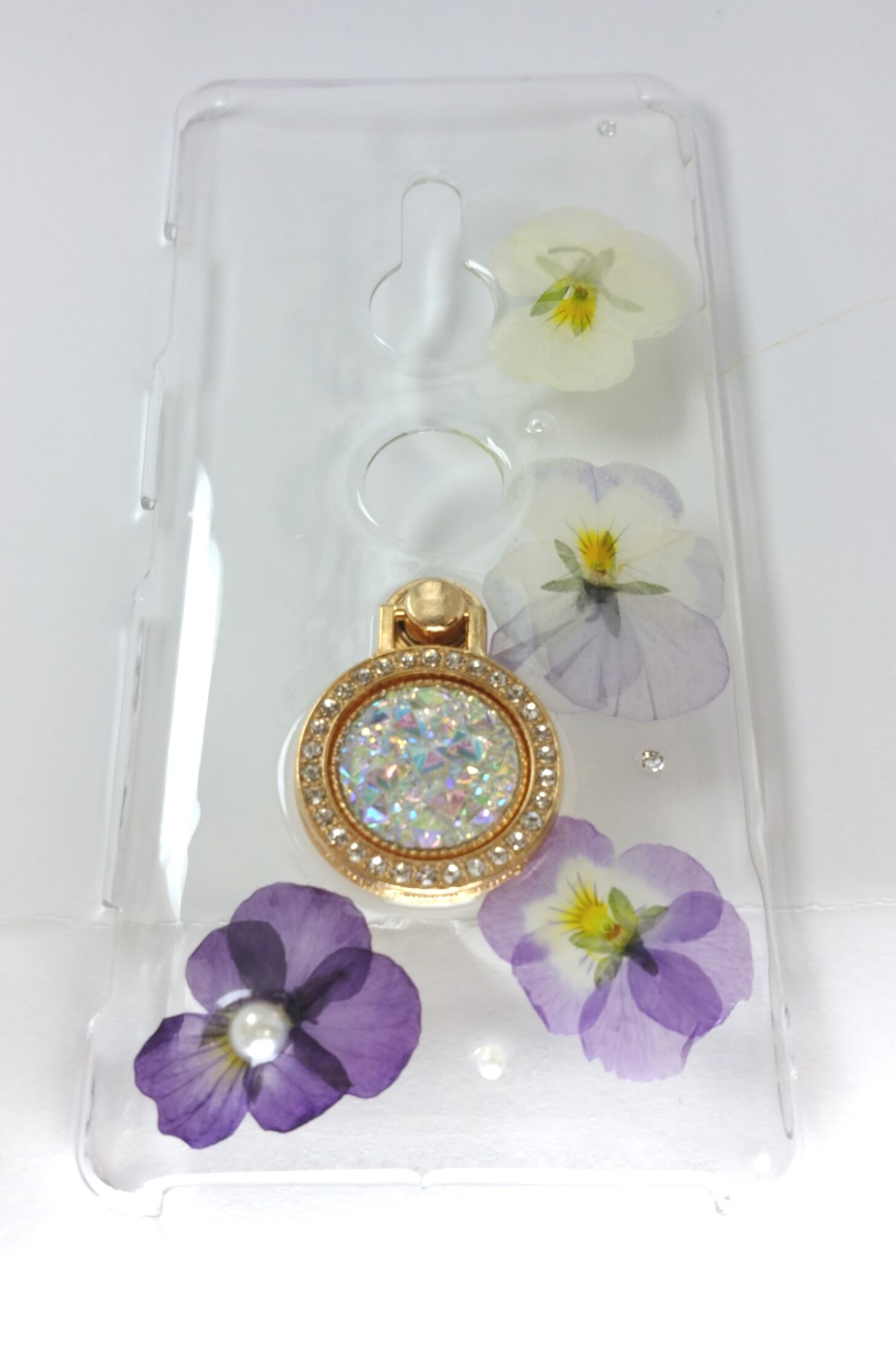 ハンドメイド 全機種対応のバンカーリング付き手作り押し花(ドライフラワー)スマホケースです。